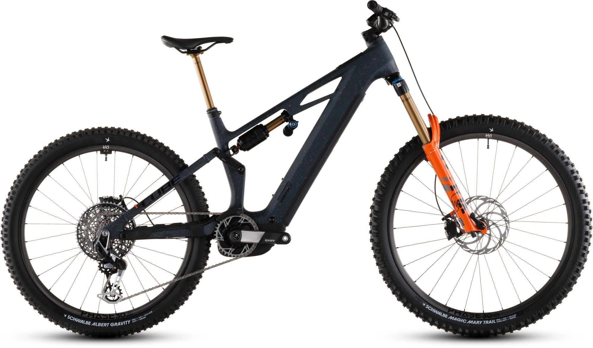 | Style | The Stereo Hybrid ONE77 HPC SLT leaves nothing on the table in its pursuit of big-mountain riding perfection. The mullet wheelset is built around a pair of Newmen Phase 30 carbon wheels, shod with Schwalbe's tough and tenaciously grippy Magic Mary and Albert 2.5in tyres. That's a good thing, because the Magura Gustav Pro hydraulic disc brakes need all the traction they can get to deliver their safe, predictable stopping power. There's a remote dropper seatpost, of course, so that you can take the more adventurous line. Sram's XX Eagle Transmission 1x12 gears are driven via a Race Face Era carbon crank ? and assistance from Bosch's smooth, quiet CX-R drive and 800Wh PowerTube battery ? for quick, precise electronic shifts. With Fox's 38 Factory fork and Float X2 Factory shock delivering 170mm of plush, well-controlled travel at each wheel, it's safe to say that the rest comes down to you. Are you up for it? Frame descriptionThe Stereo Hybrid ONE77 HPC frame ? with 170mm travel front and rear and a mullet wheel set-up with 29in front and 27.5in rear ? is all you need for big days out on big mountain trails. But, as with all CUBE designs, the devil is in the detail. So, for example, we added Integrated Cable Routing for super-clean looks, and then threw in an angle-adjustable headset so that you can tweak the handling to your taste. The 800Wh PowerTube battery sits unobtrusively in the carbon down tube, just above the Bosch CX-R drive. A UDH dropout on the aluminium rear triangle is tough and future-proof, and we also added a Direct Mount chain guide to keep you driving forwards even when the going gets rough. The Stereo Hybrid ONE77 HPC frame ? with 170mm travel front and rear and a mullet wheel set-up with 29in front and 27.5in rear ? is all you need for big days out on big mountain trails. But, as with all CUBE designs, the devil is in the detail. So, for example, we added Integrated Cable Routing for super-clean looks, and then threw in an angle-adjustable headset so that you can tweak the handling to your taste. The 800Wh PowerTube battery sits unobtrusively in the carbon down tube, just above the Bosch CX-R drive. A UDH dropout on the aluminium rear triangle is tough and future-proof, and we also added a Direct Mount chain guide to keep you driving forwards even when the going gets rough. |